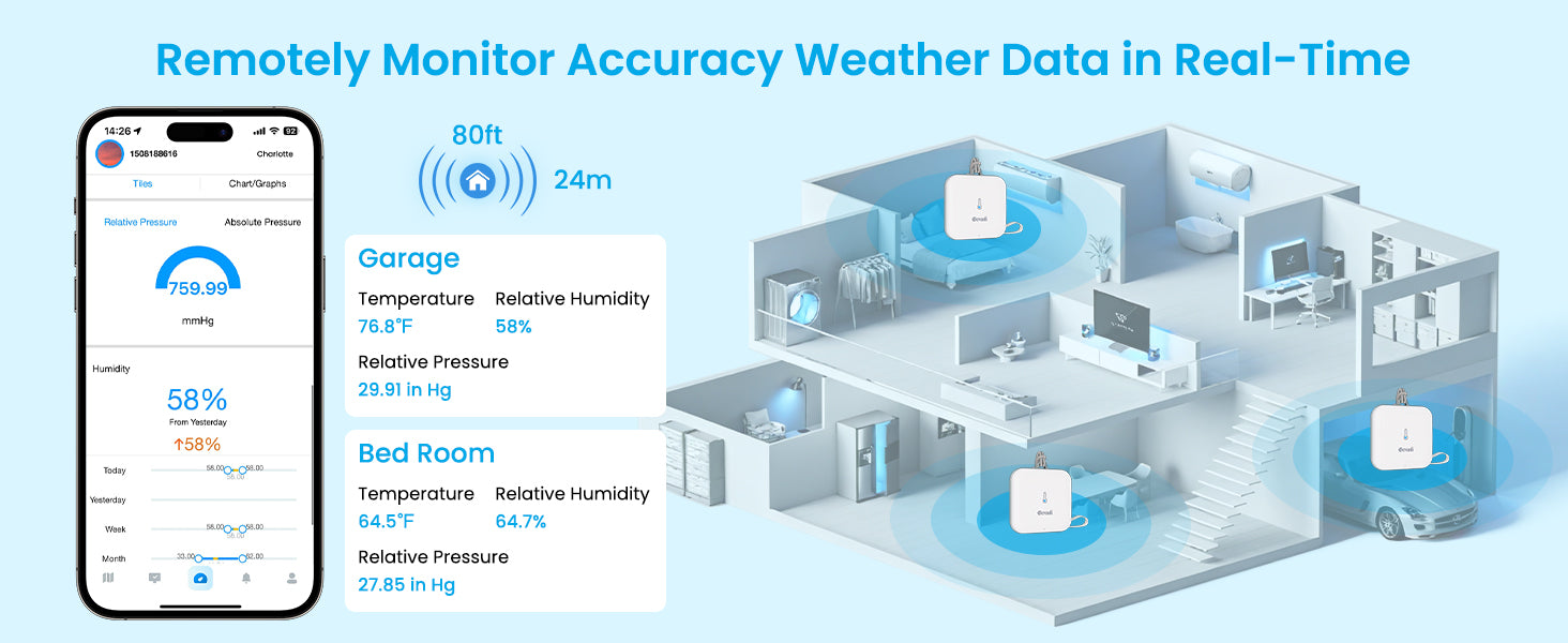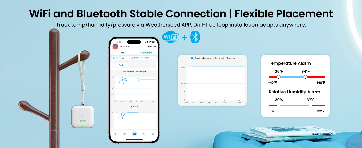 - 24/7 Instant APP & Email Alerts: Set custom temperature, humidity, and barometric pressure ranges, and receive instant alerts via the Weatherseed APP or email whenever levels fall outside your preset range. This feature is ideal for quickly reacting to sudden changes in sensitive environments like greenhouses, basements, or any room