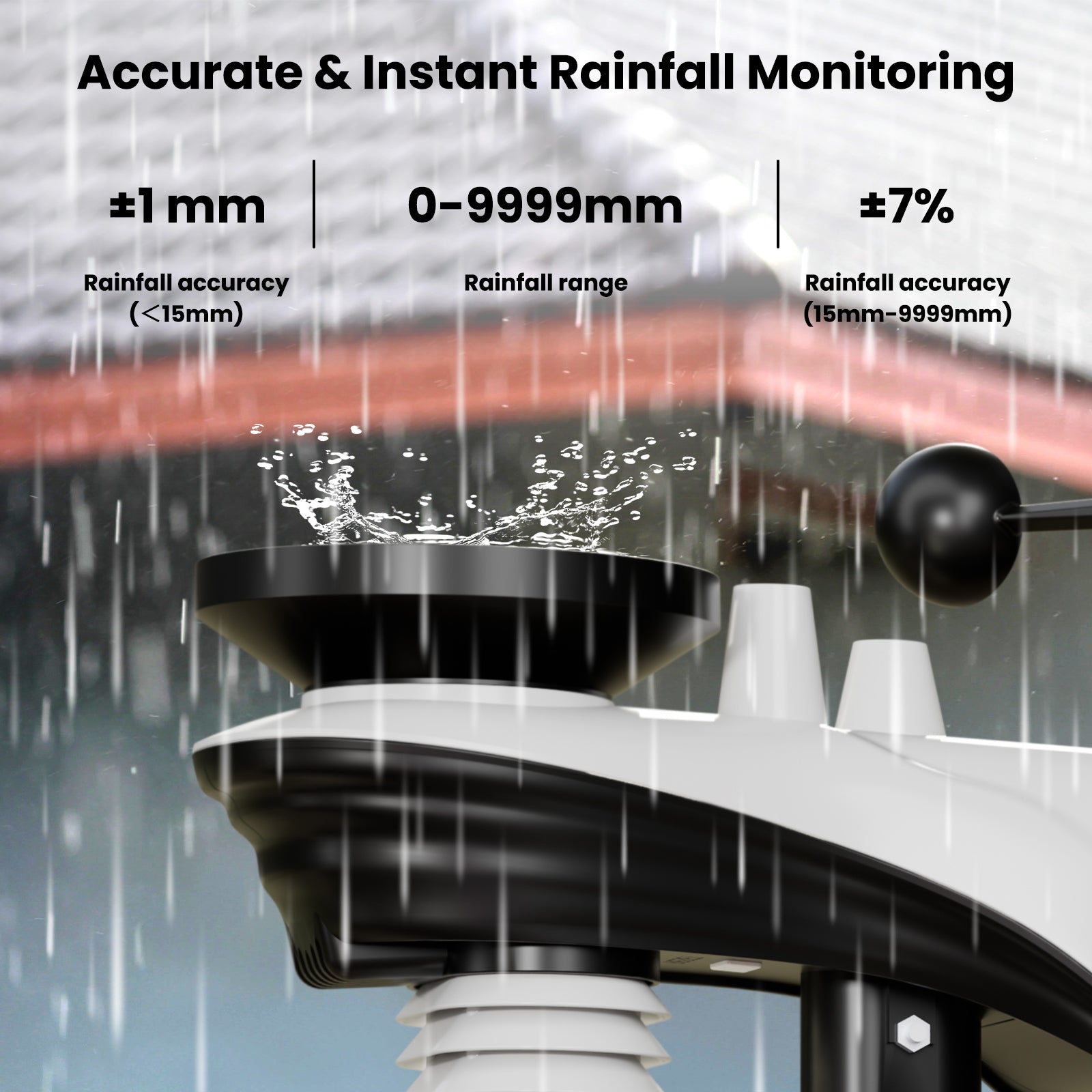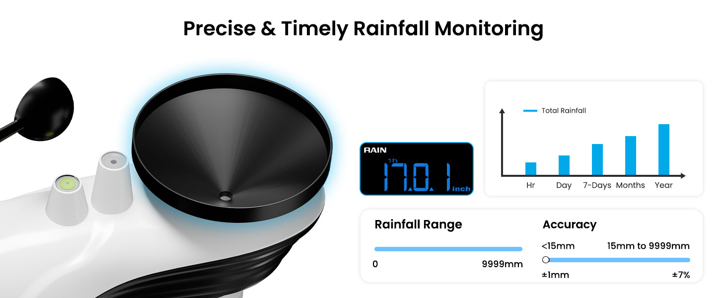 - Precision Rain Gauge: The rain gauge of this weather station has a high level of accuracy, achieving ±1mm precision for rainfall under 15mm and ±7% accuracy across its full 15-9999mm measurement range. The Weatherseed app automatically logs hourly, daily, weekly, monthly, and cumulative rainfall data – providing reliable hydrometeorological intelligence essential for mission-critical applications including technical analysis, engineering projects, flight operations, weather monitoring, and environmental research.