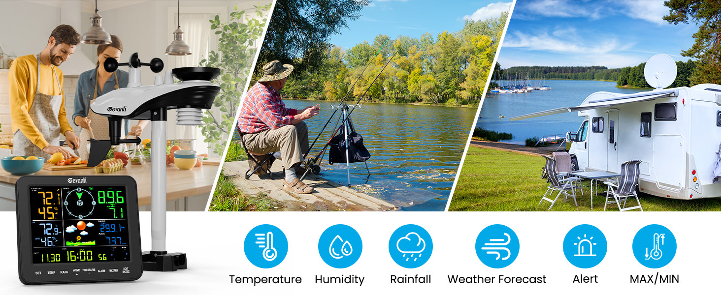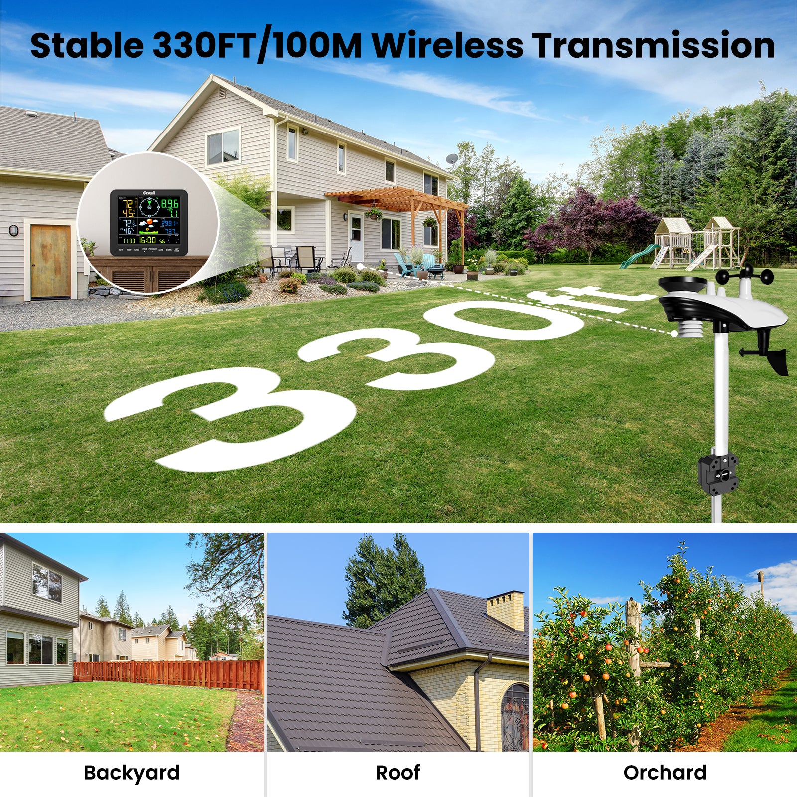 330ft Wireless Transmission: The 330ft long-range transmission maintains strong connectivity across expansive areas—from orchards and pastures to rooftops, piers, and RVs—penetrating obstacles like trees or walls without signal drops. This ensures the uninterrupted transmission of data for homeowners, farmers, gardeners, and coastal residents, providing reliable weather data.