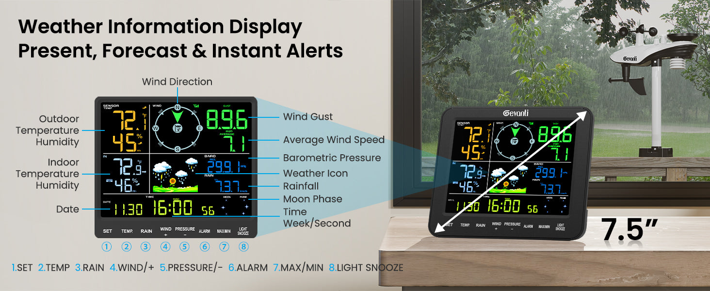- Easy to Read Display with 3-Level Backlight: This weather station is equipped with an 8.15" high-contrast color screen and extra-large bold fonts, making the information clear at a glance. It also features manual 3-level backlight adjustment, ensuring clear display whether in the bedroom, kitchen, backyard, or garden. It is especially suitable for middle-aged and elderly users, providing a comfortable and low-fatigue visual experience and making it easier to obtain information.